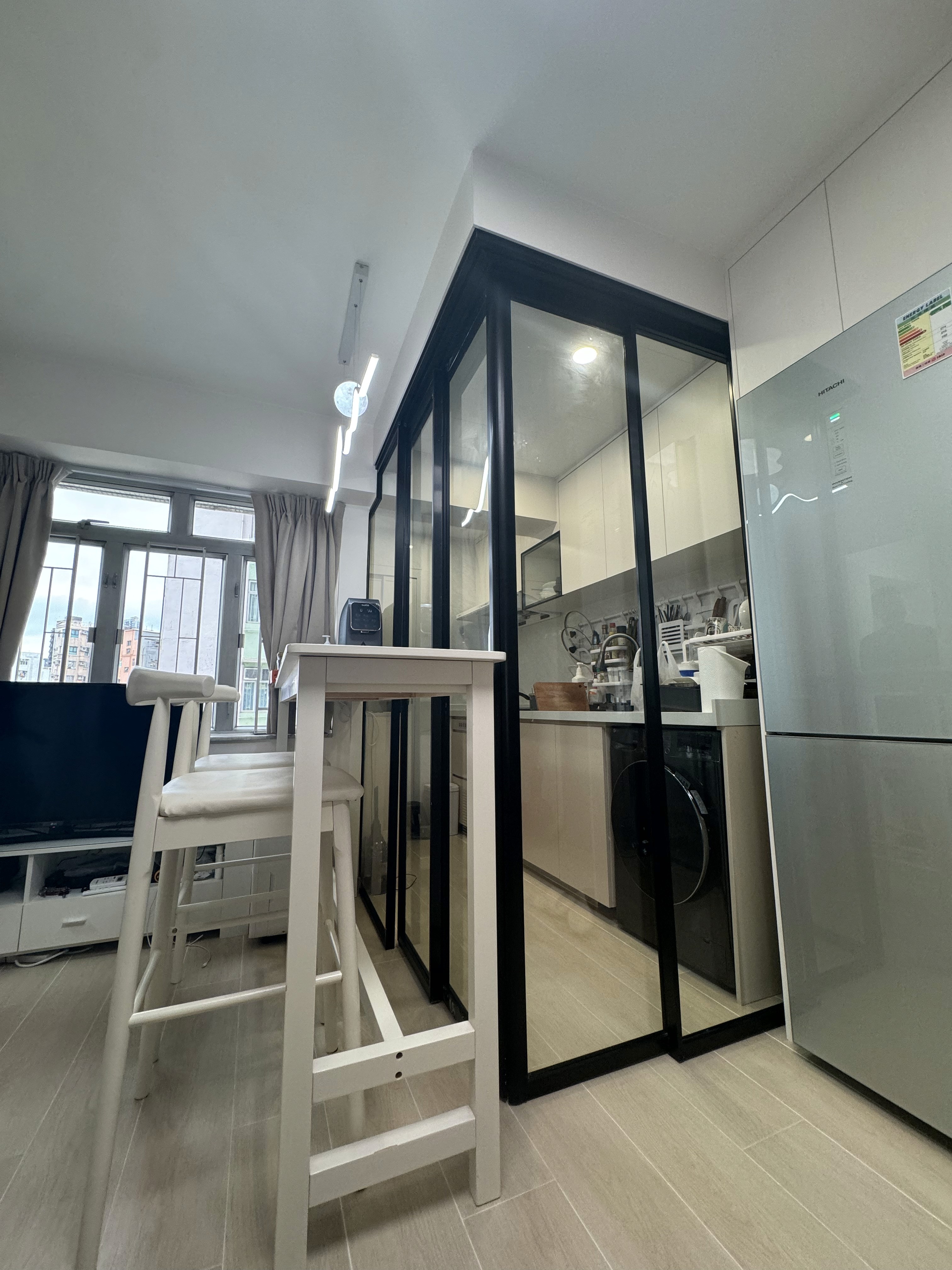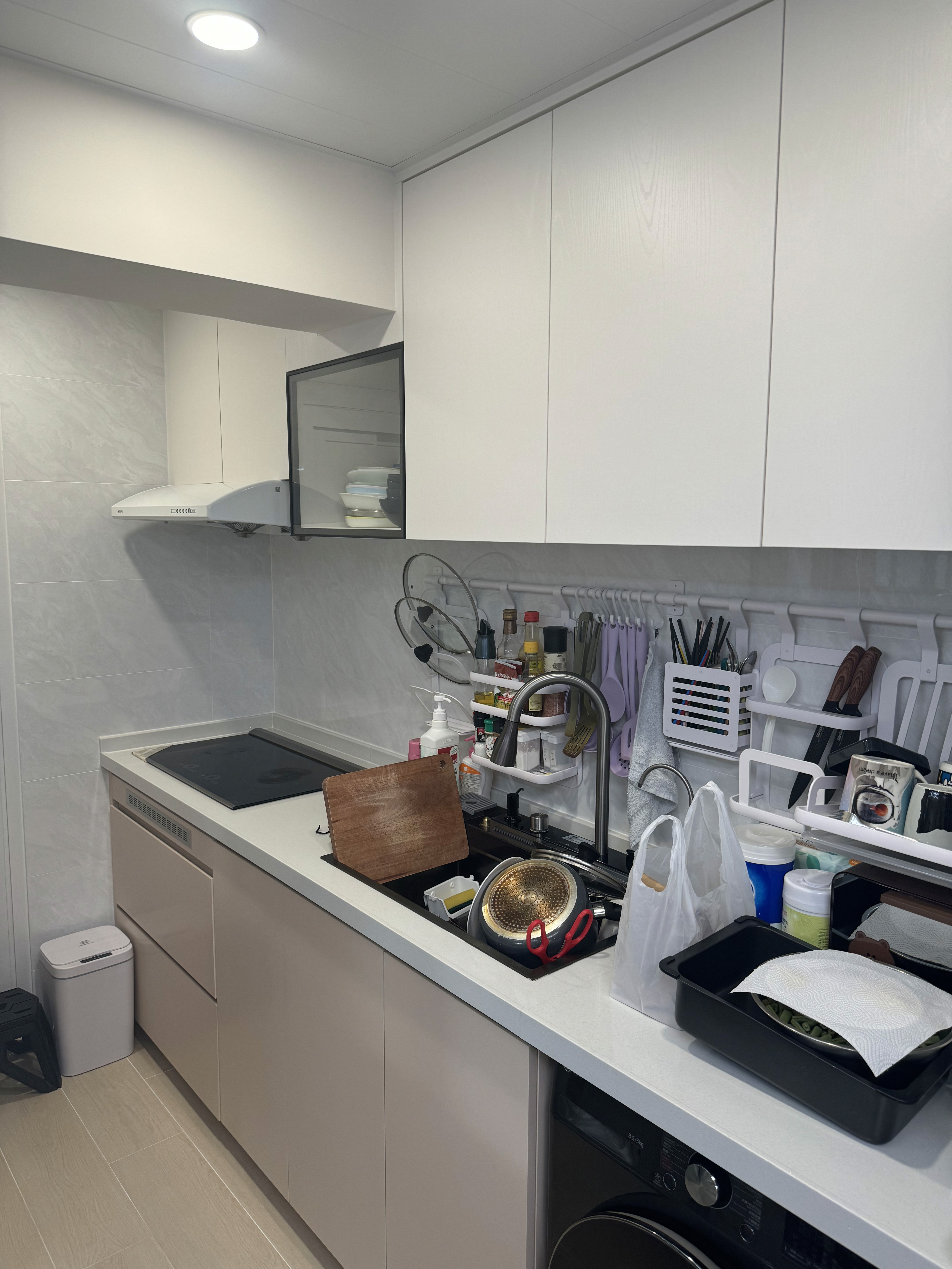為咗滿足家庭嘅生活需求,我哋喺每個空間都花咗唔少心思。廚房採用開放式設計,配上奶油色嘅廚櫃門板同玻璃趟門,既可以保持空間感,又能有效隔絕油煙。主人房為咗善用窗台位置,將睡床加高,床下增加咗儲物櫃桶,同時亦預留空間擺放梳妝枱。小朋友房就訂造咗上格床,樓梯結合咗儲物櫃桶功能,下面係衣櫃,另一邊就係書檯同書架,將空間利用到極致。至於洗手間,就採用咗深淺對比色設計,配備一體式石盤同埋有除霧功能嘅智能鏡櫃,美觀又實用。