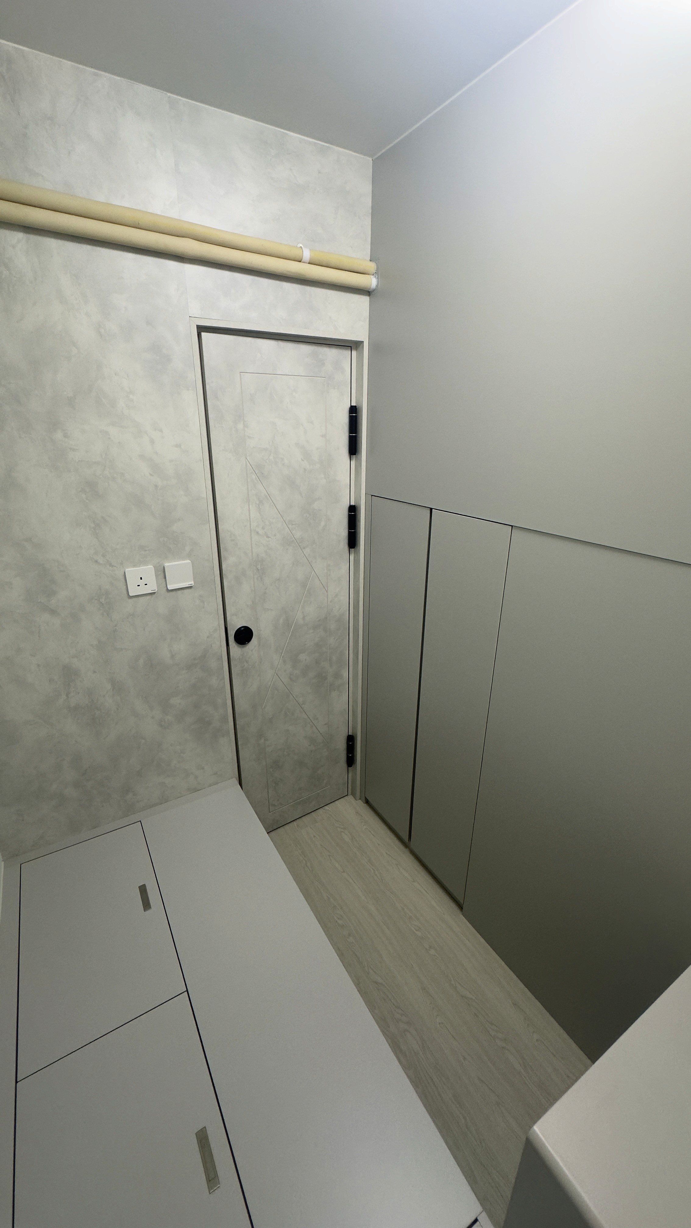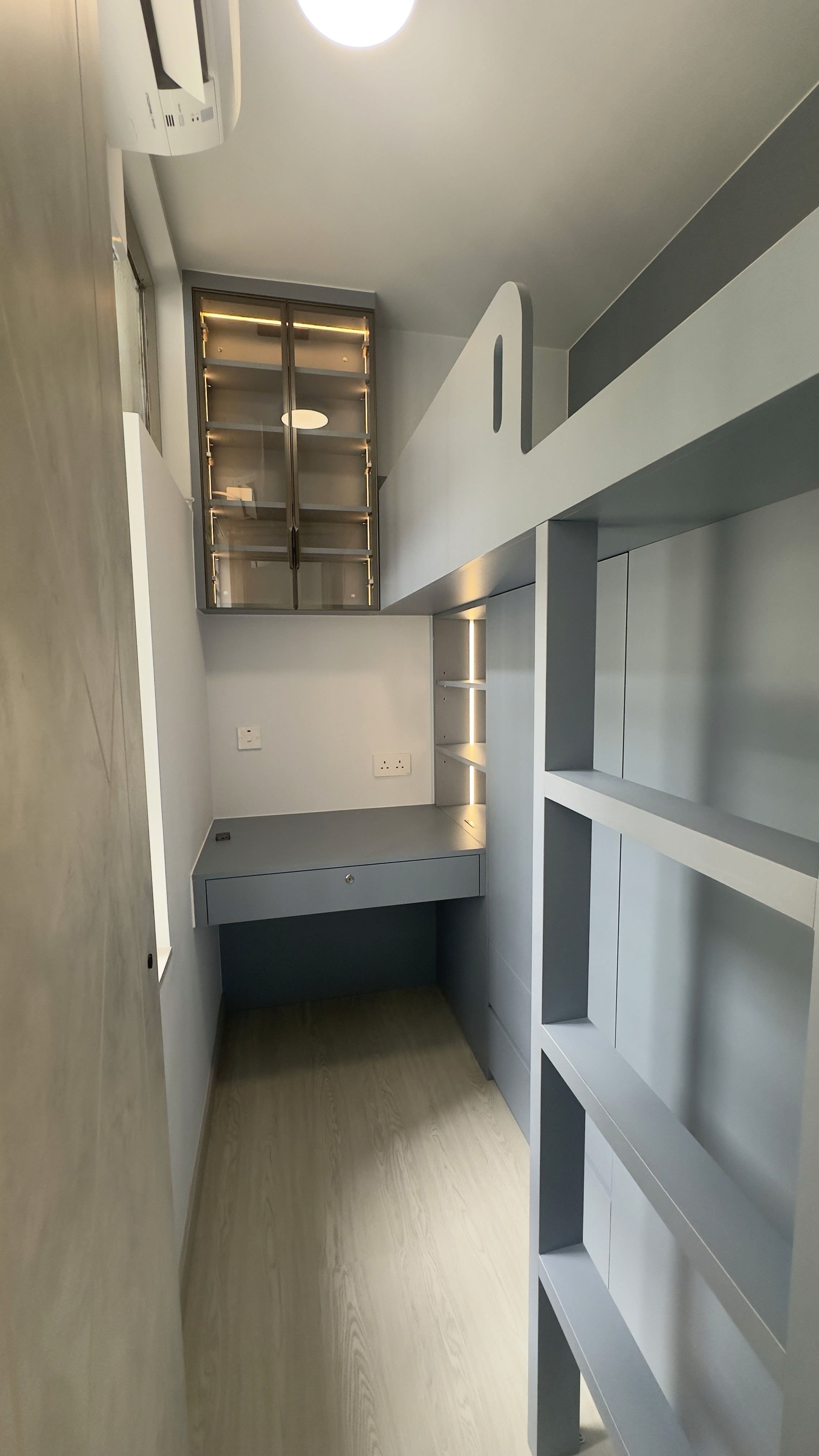 安秀苑一個456呎嘅單位,全屋設計主打實用風格,因為住咗户主夫婦、兩個小朋友同埋工人姐姐,所以對儲物空間有極大需求 。設計師喺玄關位造咗一組C字櫃,除咗有收納鞋履嘅功能,上方仲巧妙咁整咗個有趟門同百葉氣窗嘅「工人姐姐小天地」,連通往上格床嘅梯級都變成咗儲物櫃 。廳入面仲有一張隱藏式嘅蝴蝶飯枱,甚至連餐櫈都可以收埋入櫃入面,食完飯收埋就可以令活動空間大增 。另外,客廳特設一個巨型拉出式衣櫃,用盡每一吋空間去擺放雜物同工人姐姐嘅衣物