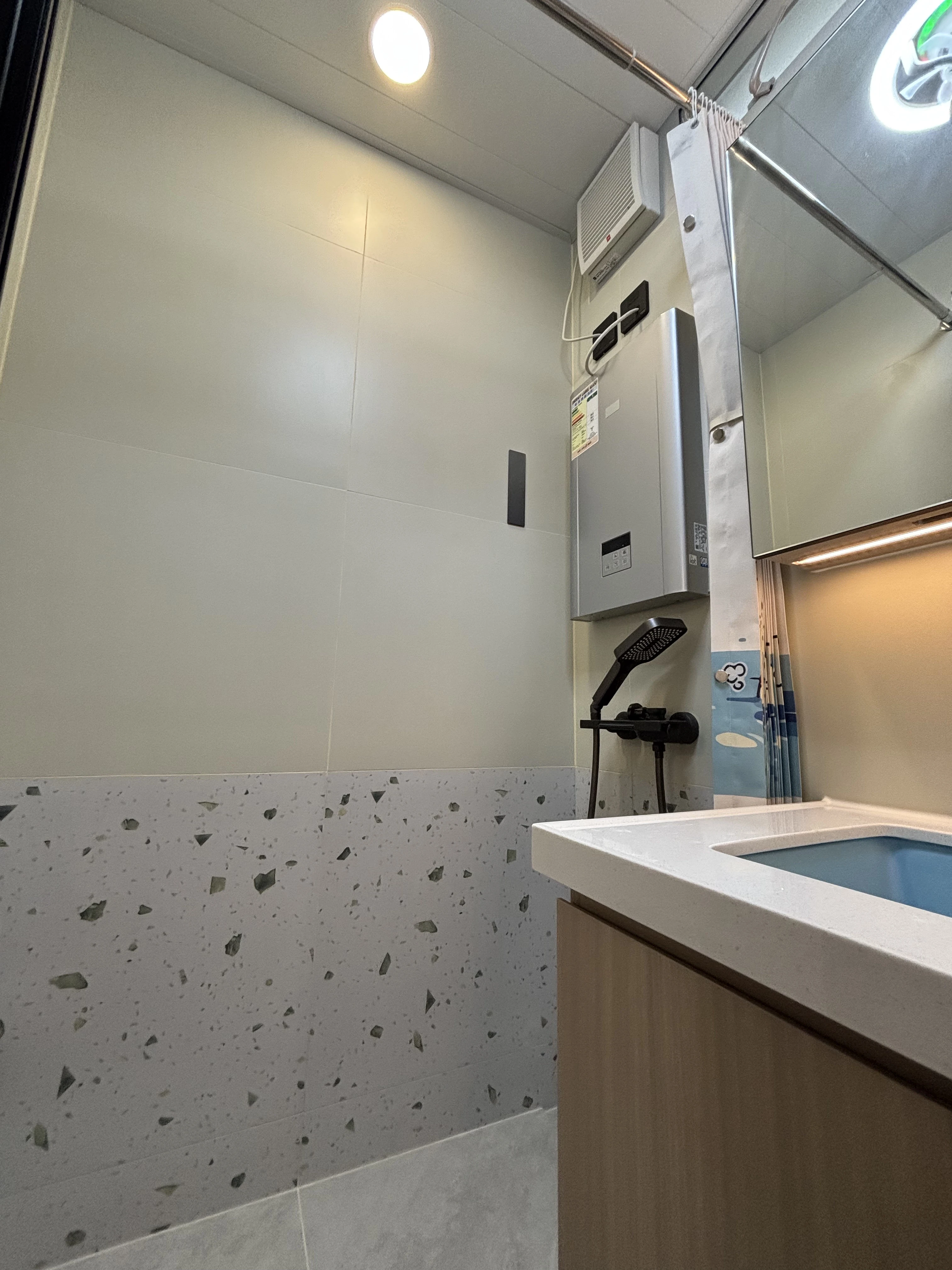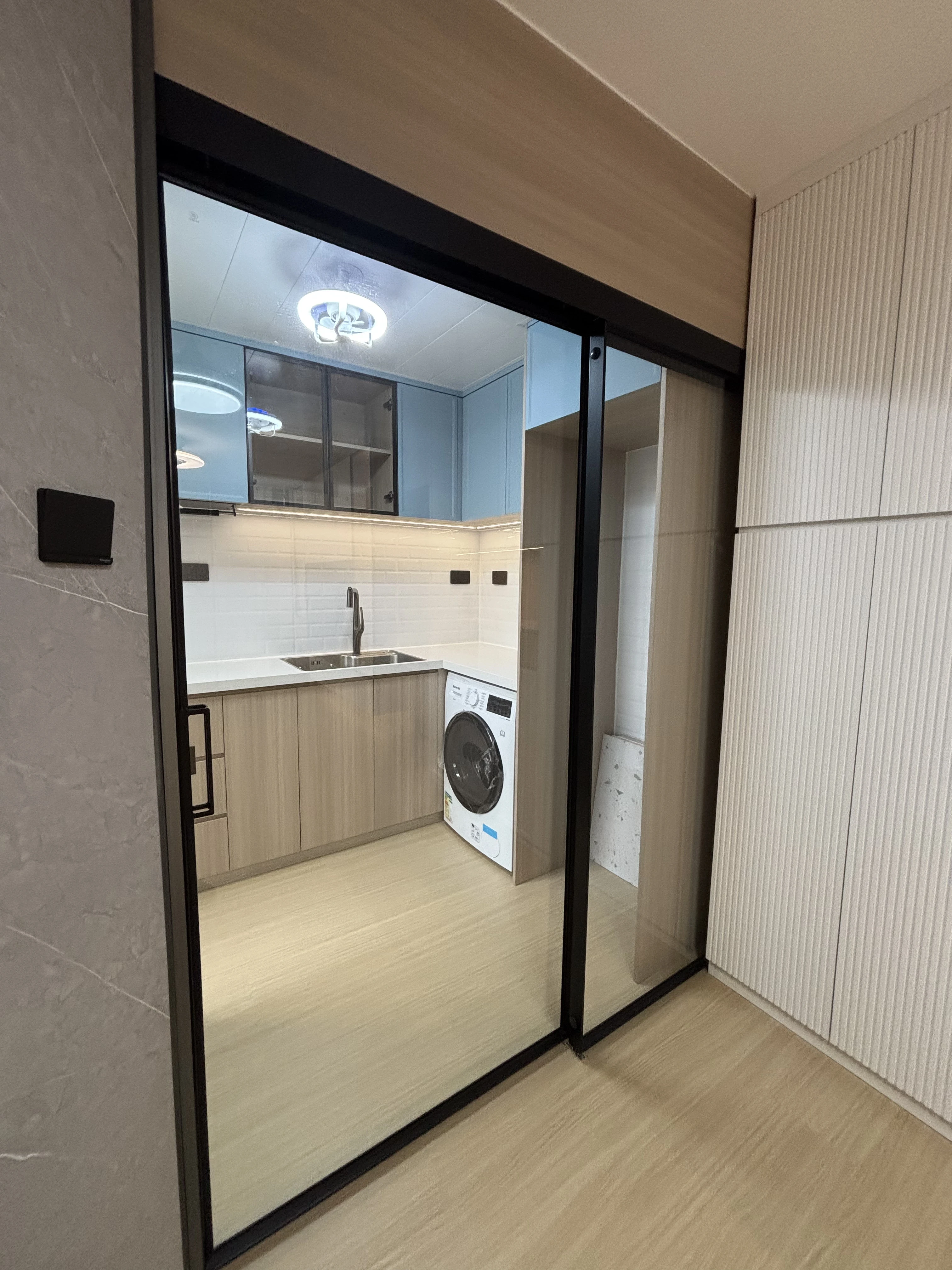 呢個單位嘅設計風格以實用為主,同時融入咗唔少貼心嘅細節。為咗將兩個房間嘅門口整合得更美觀,我哋造咗一套具備緩衝功能嘅隱藏門,令牆身視覺效果更統一。主人房考慮到夫婦二人嘅作息時間唔同,特別設計咗上下隔床,咁就唔會互相影響休息。廚房方面,採用咗湖水藍同桃木色嘅配搭,加上帶有白色石紋嘅石英石枱面,感覺清新。為咗方便戶主煮食,我哋仲加設咗兩個非常實用嘅下拉式拉籃,可以擺放調味料同刀具,用完收返埋,就可以保持枱面乾淨企理